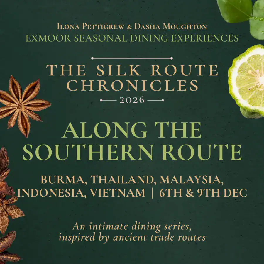 A Silk Route Chronicles evening shaped by the food cultures of Burma, Thailand, Malaysia, Indonesia and Vietnam. This event looks to the southern maritime routes, where spice, citrus, herbs, smoke and slow hospitality meet at the table. Expect a menu led by brightness, warmth and layered flavour — generous, expressive and rooted in the movement of ingredients, ideas and shared meals across the region.